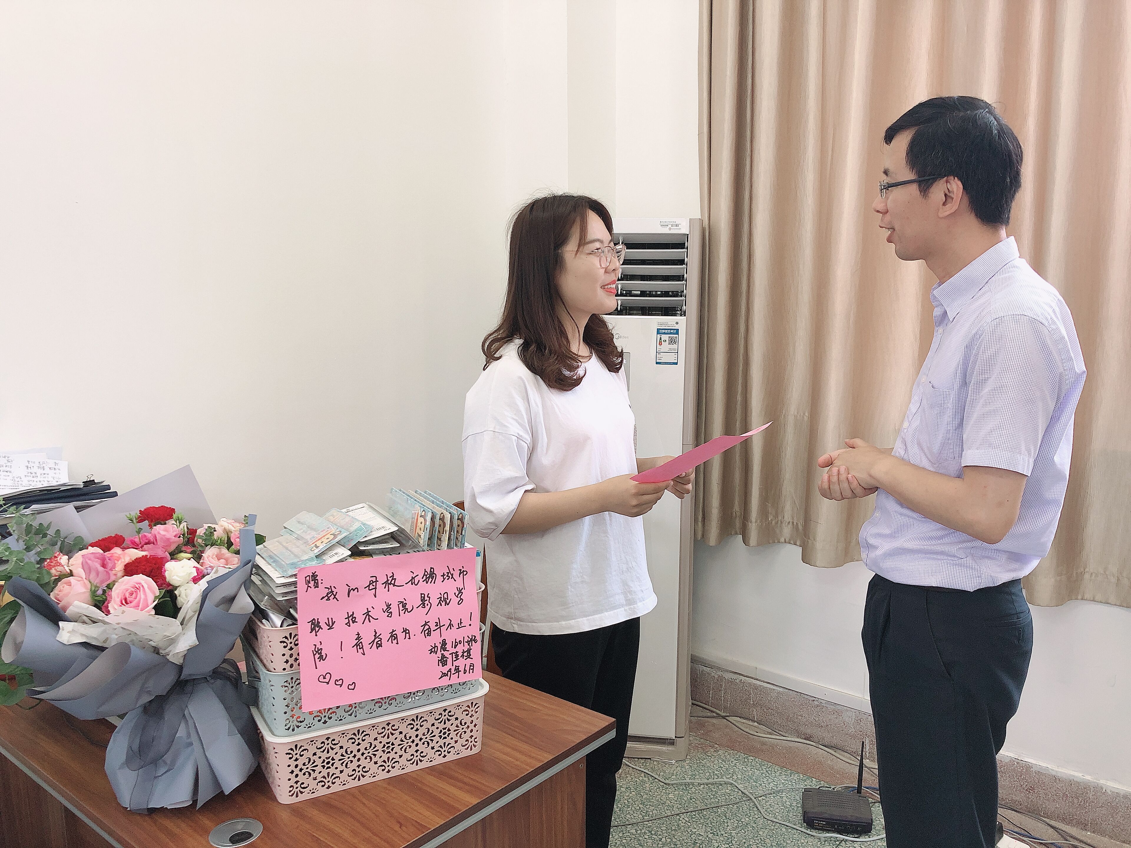 不忘初心城院情,青春追梦一路行。近日,影视学院学生党员、2019届毕业生潘佳祺同学来到教2405办公室,向学院老师表达了离校的不舍与对在校学习的珍忆,并向学院分团委学生会赠送纪念礼。学院党总支副书记贾迅、学工办主任王菲参与了交流。 潘佳祺同学说道,这三年来,她从一名普通团员成长为一名学生党员,经历了很多,也收获了很多。特别是在影视学院建立初期,她与老师同学一起彻夜努力,配合老师搭建新的学生会、组织同学参与团学活动等,都让她深深感受到学院师生的凝聚力、“弘毅”校训的影响力以及学院党组织的示范引领力。 对于毕业赠礼,她说道,作为学院第一个发展的学生党员、第一个学生会主席,对学院有着道不尽的感情,所以,一点小小的礼物希望能学院带来大大的祝福,也祝愿学院发展更加欣欣向荣。 贾迅书记寄语潘佳祺 贾迅代表学院向潘佳祺同学表达了感谢。他表示,“不忘初心、牢记使命”是一名党员想事、干事、成事的依托,希望她今后不管在哪里,都要发挥好党员的模范带头作用,让自己、让他人,都能一起收获成长的喜悦,见证日益繁荣的美好。无锡城院、影视学院,永远是咱们同学的温馨休憩之地、奋斗蓄能之地、创新激励之地。 据了解,一直以来,影视学院党总支都非常注重对师生入党积极分子的培养,对师生党员的思想教育与实践引导。这一次学生党员回校“思源”,也是学院围绕“立德树人”根本任务,发挥基层党组织育人育才作用的一个重要鼓励。(撰稿:王菲) 王菲老师向潘佳祺同学颁发感谢证书 |