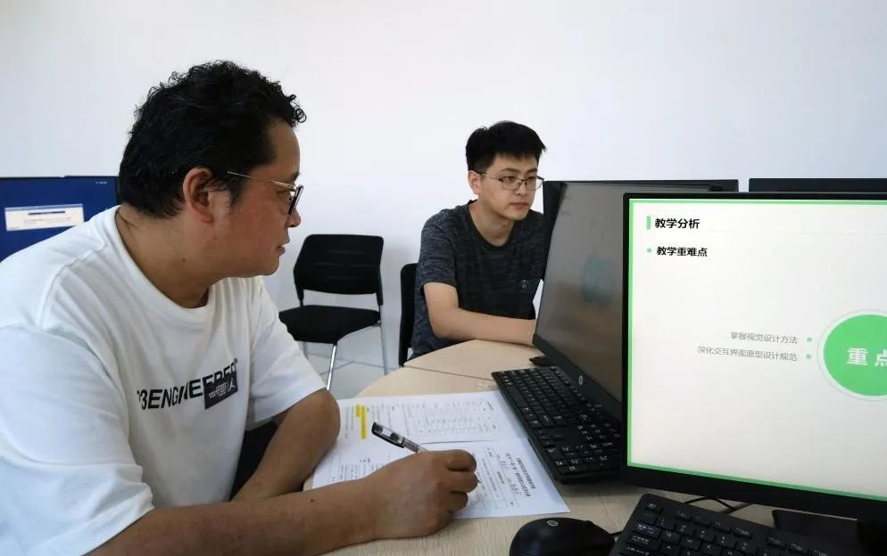 为进一步引导和激励我院中青年教师在岗位苦练技能,提高业务素质和实操水平,弘扬新时代“工匠精神”,打造双师人才工作新引擎,促进教师专业发展,提高教师综合素质,加强教师队伍建设,提高教育教学质量,推动我院更好发挥中青年人才集聚效应,影视学院于6月16日在数字影视综合摄影棚二期实训室举行“一院一策”教师技能大比武活动。 党总支副书记左占卫赛前致辞 学院努力营造全员教师大练兵的良好氛围,覆盖数字影视系和人物形象设计系中青年教师。特别重视新教师、薄弱学科教师的专业水平提升。通过岗位练兵,深化校本研修的内涵,拓展校本研修的外延,提高教师校本研修的质量与水平。 赛前交流 《UI界面设计》——柴彦宇 赛后评分 本次大比武注重层次性。专业课教师侧重技能训练、实训课训练;骨干教师侧重思政融入、教育智慧和教学风格的培养与提升,使不同层次的教师有不同程度的提高。