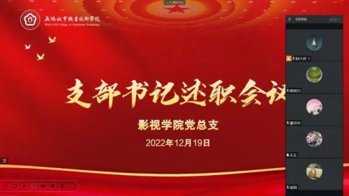 为进一步发挥党建核心引领作用和党支部战斗堡垒作用,进一步加强影视学院专业建设和教学科研能力建设。12月23日,影视学院举行2022年度党支部书记述职评议会议及教师述职大会。两次会议都采取线上会议方式举行,由原影视学院党总支副书记左占卫主持,影视学院副院长秦潇璇,影视学院党总支副书记姚明兴以及影视学院全体教师参加了会议。 在党支部书记述职评议会议上,影视学院教工党支部包雅丽老师和学生党支部胡琪老师分别围绕支部工作履职情况、存在问题、下一步工作计划等方面进行述职,总结了工作成效及亮点,认真反思了存在的问题和不足,并对2023年工作提出了总体思路和目标任务。述职结束后,与会领导作了对应点评,充分肯定了取得的成绩,指出了改进工作的意见建议。 姚书记强调,各党支部要以这次党建述职评议会为新起点,全面贯彻党的二十大精神,以对党的事业高度负责的政治担当,以永远在路上的恒心韧劲,把党建工作责任扛稳扛好,守正创新、团结奋斗、勇毅前行,为学院高质量发展提供强大动力。