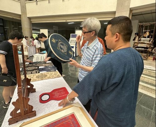 参会嘉宾集体参观了纺大非遗团队和非遗继承人的创新作品,以及纺大文旅部、教育部、人社部研培计划纺织非遗成果展。