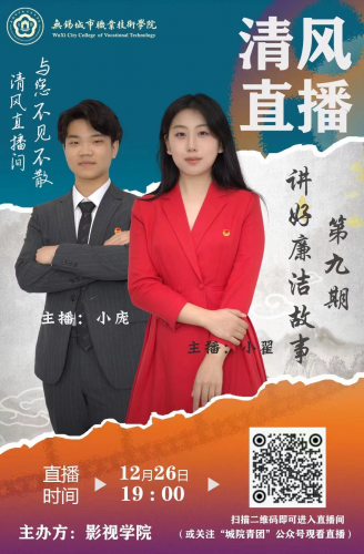 为了促进清正廉洁之风进校园、在校园,让同学们将廉洁记心中,影视学院主持承办了本次清风直播间活动。 直播内容丰富有趣,将在同学们的设计及故事中为大家介绍清风廉洁在我们身边。包括大家所熟悉的妆容、服饰还有数字化的影像建模以及生活用品等方面向大家分享。当然还有大家所熟知的朗诵、流行乐还有rap等多样的形式,由老师学生齐上阵,和大家共同度过难忘、宝贵的时光。 直播中亮点多多,多才多艺的同学们也为大家贴心准备了主题限定小礼物以抽奖的方式进行现场赠送,积极互动、积极参与就有机会获得哦! 想一起看看影视学院的帅哥美女们吗?想感受来自影视学院的青春力量吗?想和我们一起走进有趣精彩的直播间吗? 12月26日晚上,我们在直播间,不见不散!敬请期待!(文:史振、翟钰佳;图:赵城志;审核:徐群征) 一、直播时间: 2023年12月26日(周二)19:00-20:00 二、承办学院: 影视学院 三、直播主题: “讲好廉洁故事” 四、观看方式: (1)关注“城院青团”公众号 (2)扫描海报下方二维码即可观看 影视学院 分团委、学生会 2023年12月24日