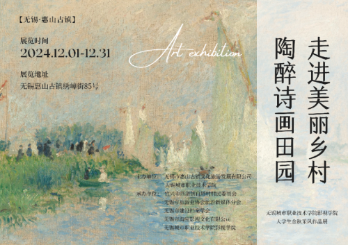 尊敬的嘉宾、影视及摄影爱好者及社会各界朋友: 您好! 在这个收获的季节里,自然之美与人文情怀交织成一幅幅动人的画卷。为展现当代大学生对乡村之美的独特视角与深刻感悟,无锡城市职业技术学院携手无锡市惠山古镇文化旅游发展有限公司、宜兴市西渚镇白塔村村民委员会、无锡市旅游业协会旅游新媒体分会及无锡市淘宝影视文化有限公司,共同举办“走进美丽乡村,陶醉诗画田园”大学生金秋采风作品展。我们诚挚地邀请您莅临开幕现场,共享这场视觉与心灵的盛宴。 【活动详情】 开幕时间:2024年12月1日(星期日)上午10:00 展览地点:惠山文化展示馆 市惠山古镇绣嶂街85号
